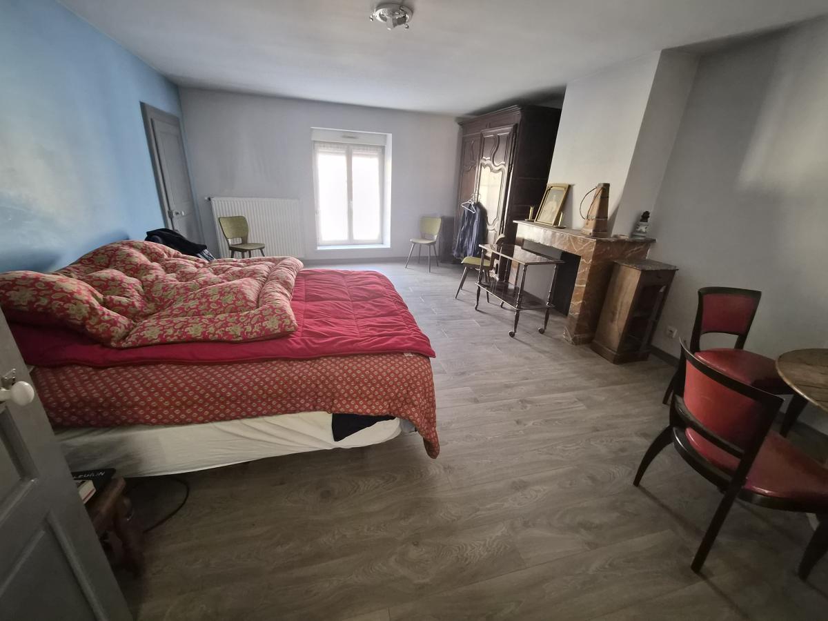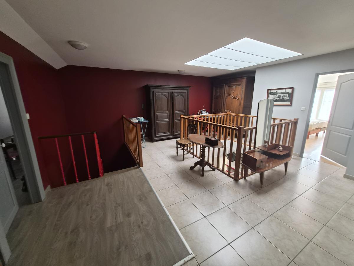 A l'étage, vaste dégagement en mezzanine, 3 grandes chambres dont une avec terrasse privative, salle de bains, WC, dégagement, grenier. Cour sur l'arrière, avec abri à bois et jardin. Parcelle de verger en annexe. Belle et vaste cave au dessous.