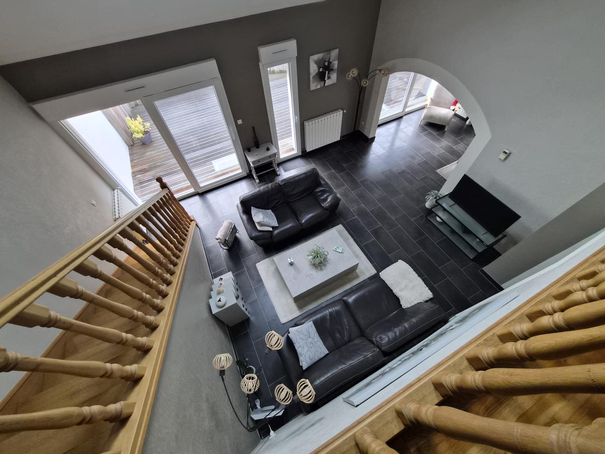A l'étage, coursive en mezzanine, 3 chambres, salle d'eau, WC. Au sous-sol aménagé, chambre d'appoint(n°4), couloir, salle de jeux, espace de stockage, chaufferie et cave.
